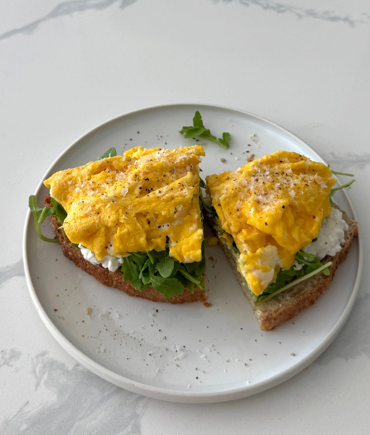 It’s not only a quick recipe you can whip up, but a recipe that provides your body with every macronutrient it needs to keep you going in the morning. You have 25 grams of protein from the eggs and cottage cheese, fiber from the avocado and arugula, healthy fats from the cottage cheese and parmigiano reggiano, and carbs from the sourdough bread. It’s filling, it’s satisfying, and it’s flavorful. You’re going to have it on repeat just as much as me.